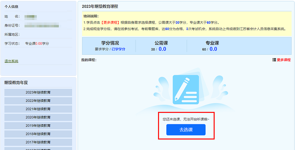 1、进入学习 -去选课,学员根据自身单位性质自行选择课程,点击开始听课,系统自动记录已学课程。