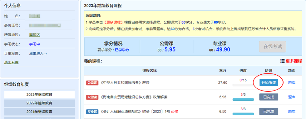 学习完规定课时(公需课30学分,专业课60学分,共90学分),可进行该年度考试,考试合格,即代表本年度继续教育完成。